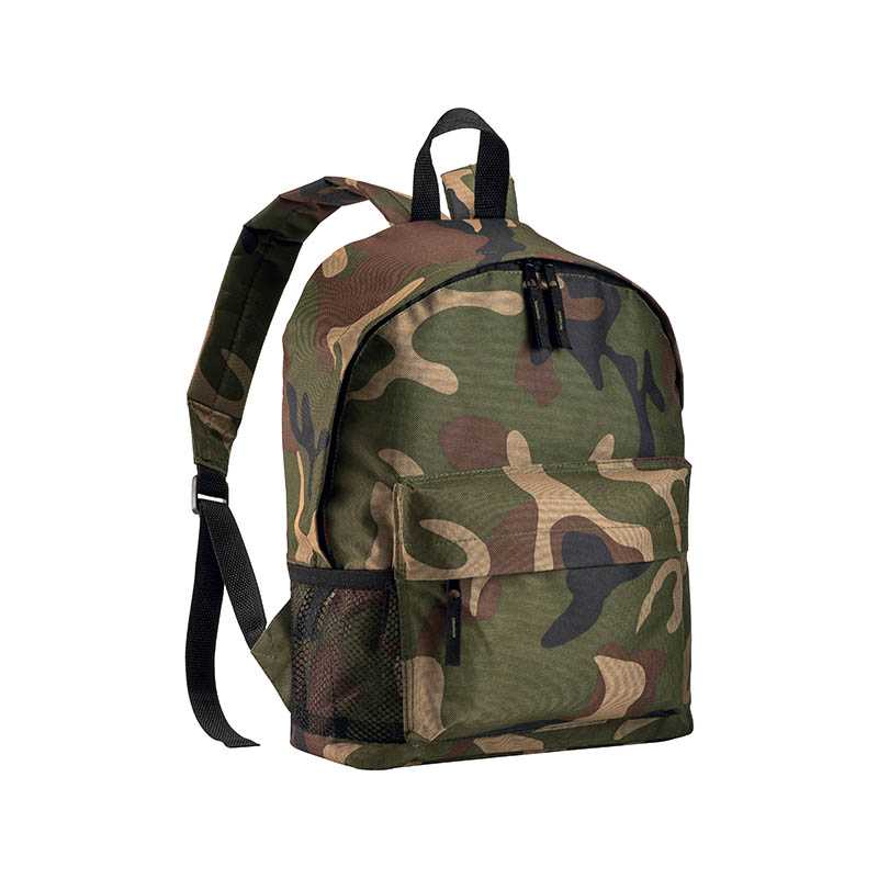 600D polyester 3-pocket camouflage backpack (one mesh side pocket). Adjustable shoulder straps and padded back