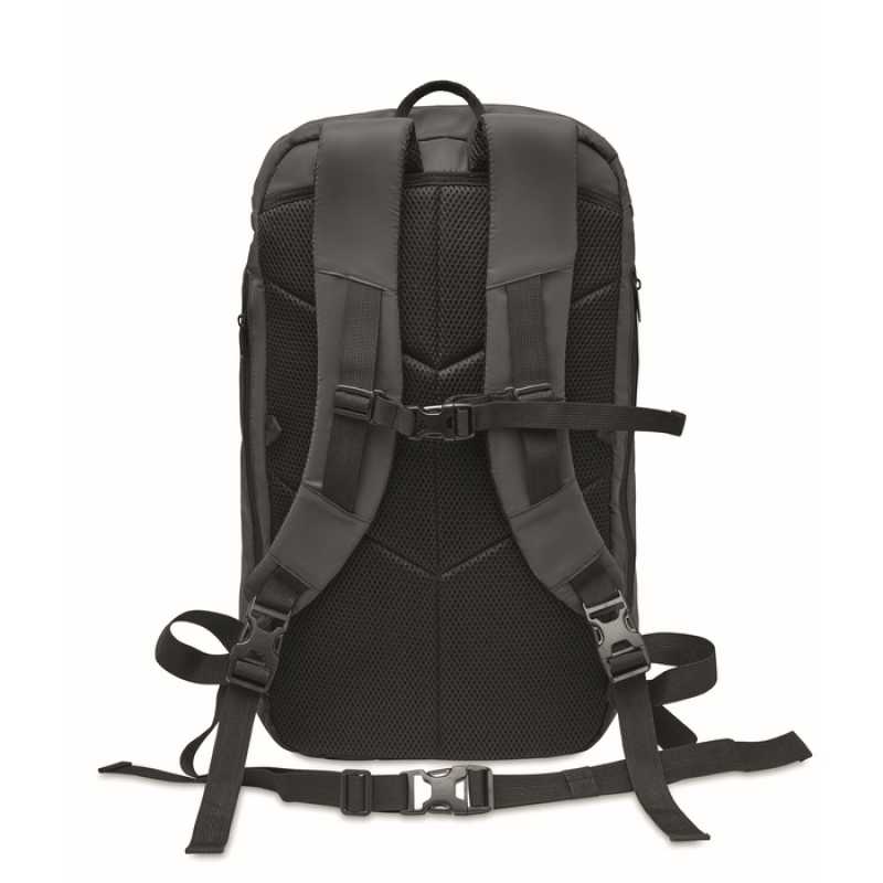Vodeodolný nylónový ruksak s viacerými priehradkami na zips, vystuženou priehradkou na notebook (15"), chrbtom a popruhmi. So vstavaným USB pripojením na power banky.