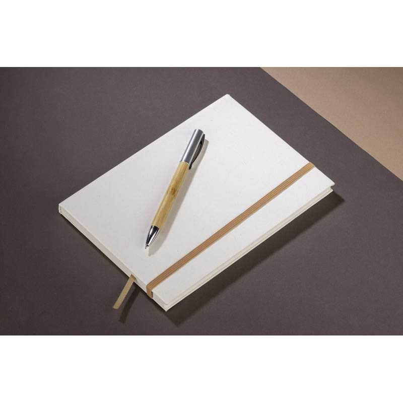 NOVINKA 2025. Zápisník A5 s tvrdými deskami z materiálu 600D RPET. Přední elastický pásek s funkcí držáku telefonu a pera. Včetně kuličkového pera s bambusovým úchopem a modrým inkoustem. Šitá vazba. 160 linkovaných stran z recyklovaného papíru (80 listů)