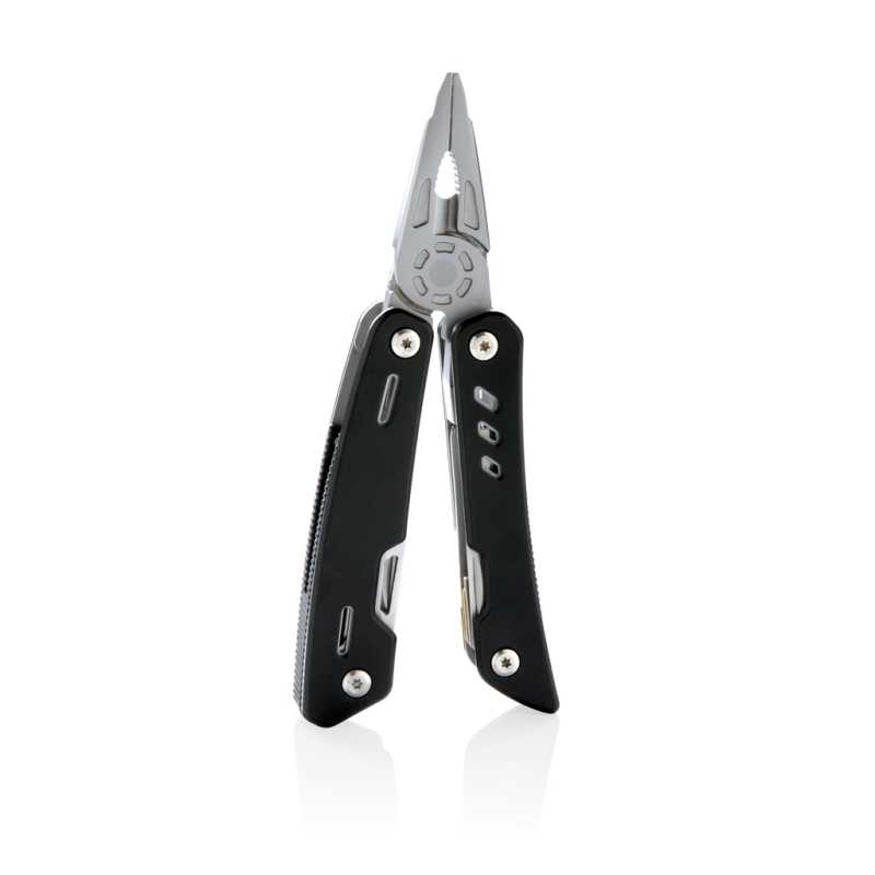 Kvalitný odolný multifunkčný nôž s 12 funkciami: kliešte s ihlovou špičkou, uťahovacie kliešte, štiepacie kliešte, nôž s rovným ostrím, nôž so zubatým ostrím, krížový skrutkovač, malý plochý skrutkovač, pílka, otvárač plechoviek a fliaš, výstružník/šidlo, pilník/veľký plochý skrutkovač. Telo z hliníka, nástroje z nerezovej ocele. Balené v darčekovej krabičke.