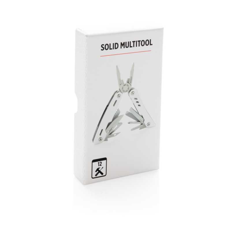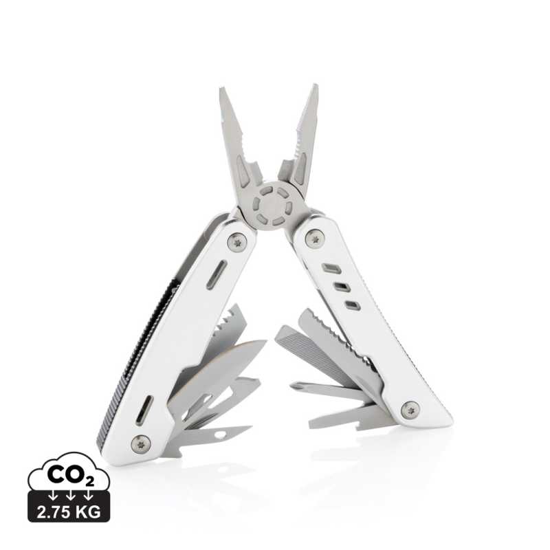 Kvalitný odolný multifunkčný nôž s 12 funkciami: kliešte s ihlovou špičkou, uťahovacie kliešte, štiepacie kliešte, nôž s rovným ostrím, nôž so zubatým ostrím, krížový skrutkovač, malý plochý skrutkovač, pílka, otvárač plechoviek a fliaš, výstružník/šidlo, pilník/veľký plochý skrutkovač. Telo z hliníka, nástroje z nerezovej ocele. Balené v darčekovej krabičke.