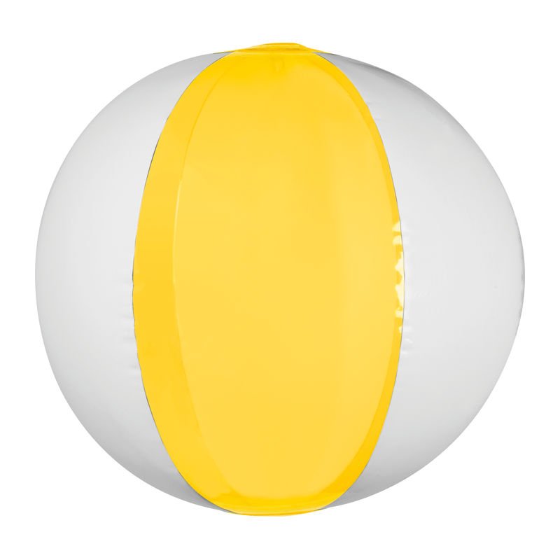 Plážová lopta so 6 panelmi, plná biela farba a transparentné farebné panely, PVC. Dĺžka nenafúknutej lopty: 370 mm.