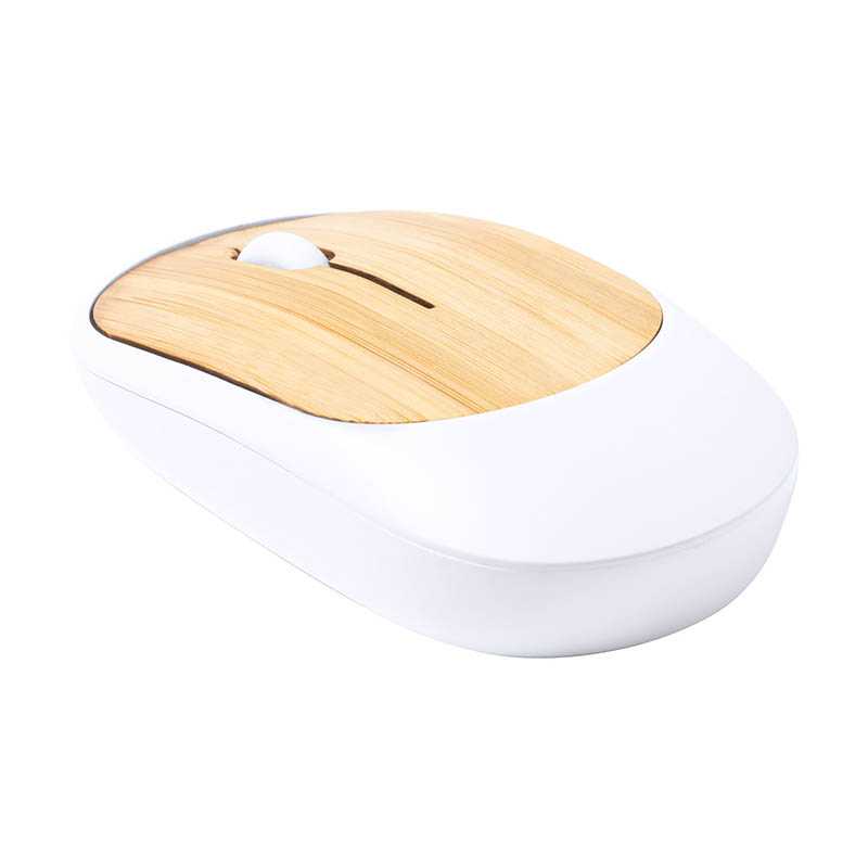 NOVINKA 2025. Wireless optical mouse in nature line with ergonomic design. Made of resistant white ABS with bamboo surface. Battery powered (1xAA not included). Presented in an individual kraft design box.