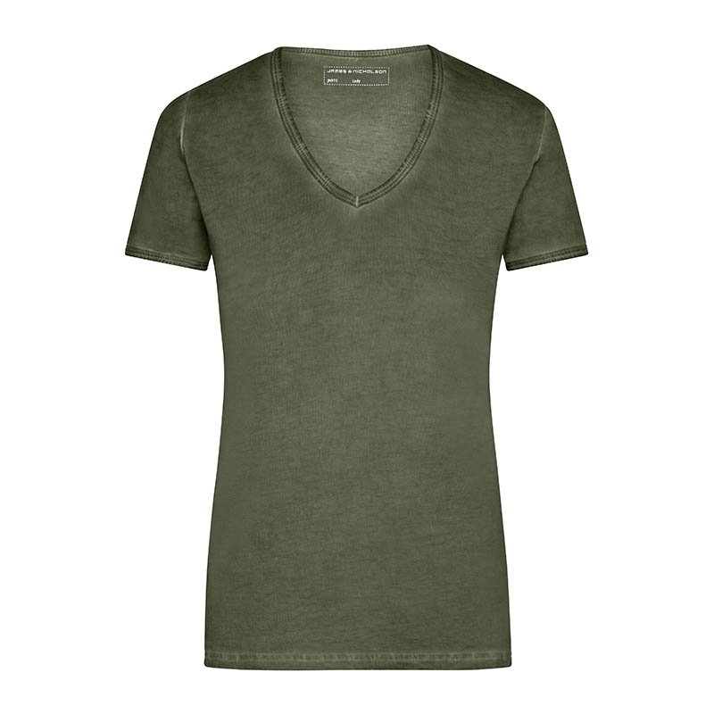 Dámské tričko.Módní tričko s výstřihem do V.Tričko je původně bílé a teprve po ušití je nastříkáno sprejem na požadovanou barevnost.Efekt barvení je velmi zajímavý..Balení: 1/50 . (ks v jednom sáčku / celkem ks v kartonu).