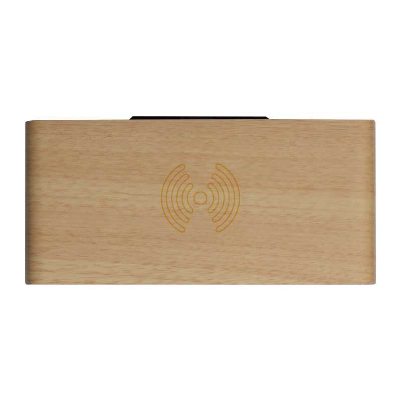 NOVINKA 2025. Multifunction clock with backlit touch screen and integrated 15W wireless charger, with USB output (5V DC 2A). Foldable and made in bamboo, with date/time and alarm functions. Lamp with 16 LEDs and 3 lighting positions, with adjustable light intensity. Type C charging cable included and compatible with devices equipped with Qi wireless charging technology. Presented in an individual kraft design box, with instruction manual in English and Spanish.Manufactured according to RoHS standards and in compliance with the following safety requirements:Overheating protection system.Over-charge protection system.Blocking system to prevent short circuits.
