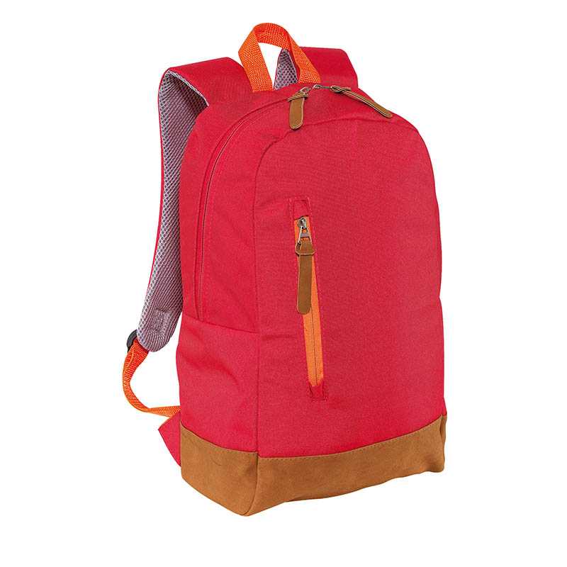 Poly canvas (600D) backpack with front pocket with Velcro closing, mesh pocket with room for one bottle on the side, and a large zipped compartment.
