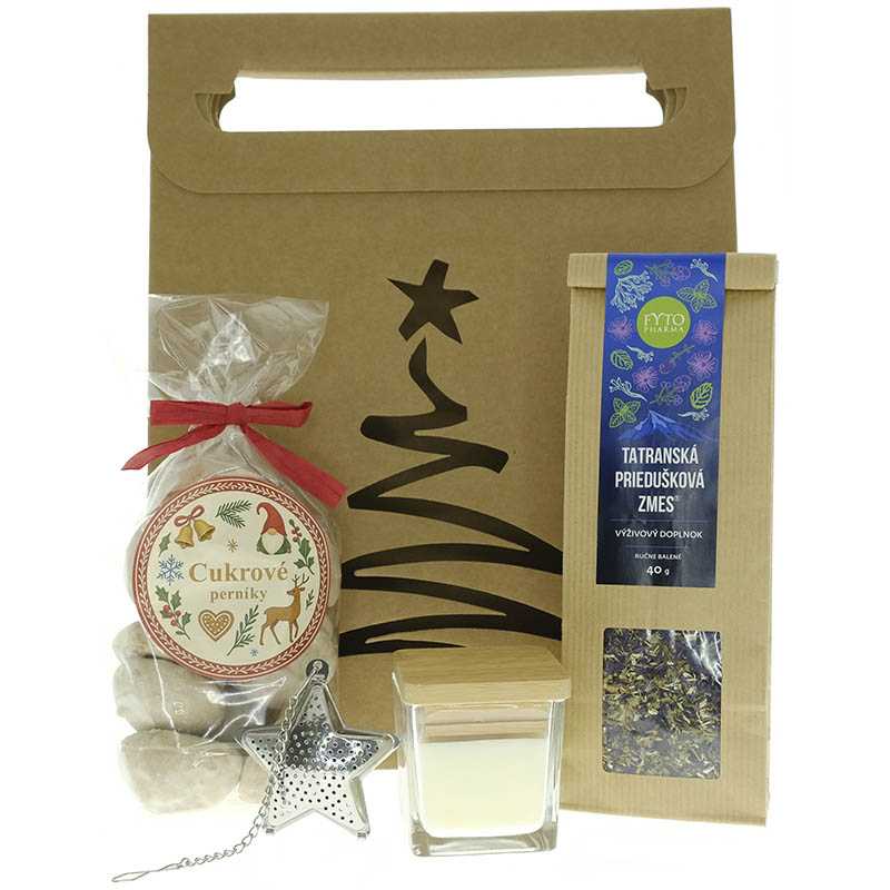 Tatranský čaj 40 g, Vonná sviečka, čajítko, Perníky cukrové 150g. Darčeková taška 30x23x10 cm