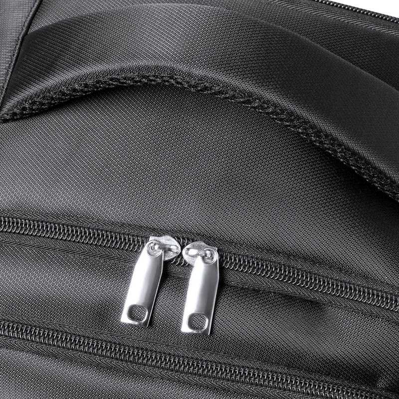 NOVINKA 2025. Premium quality backpack made of durable 600D Nyon fabric with black finish. Main compartment with matching zip closure and double puller. 3 outside pockets and 2 side pockets, all zippered. Padding on handle, back and shoulder straps, the latter adjustable. Inside with padded compartments for laptops up to 17 inches and tablets up to 12 inches. Backside attachment for trolley fitting.