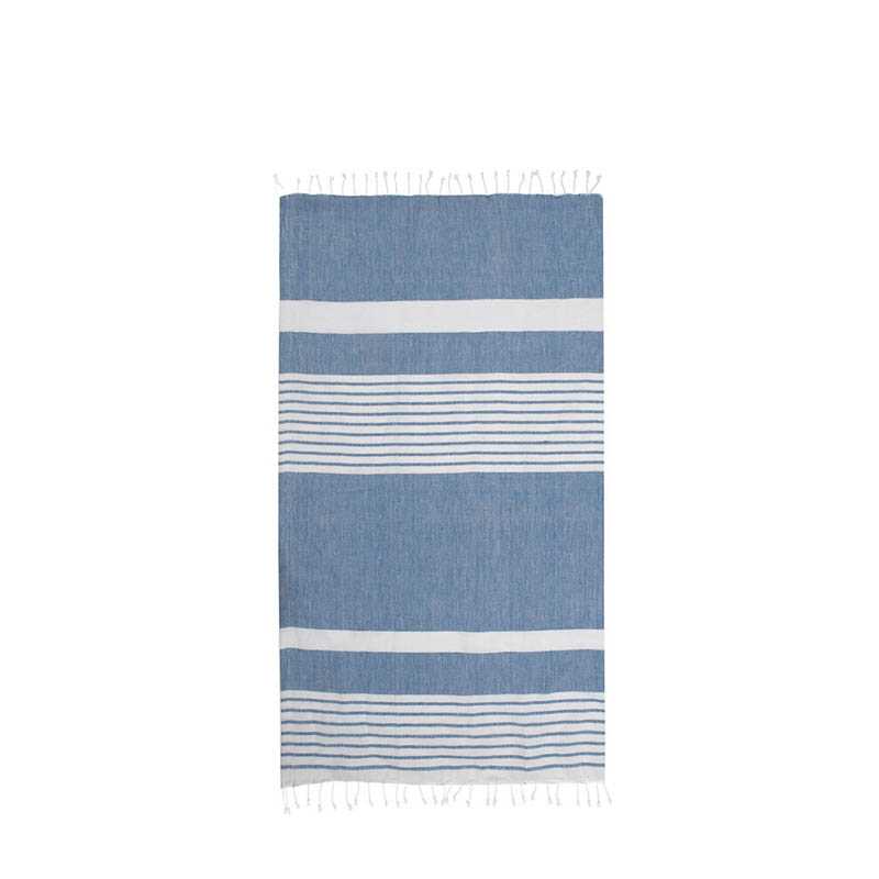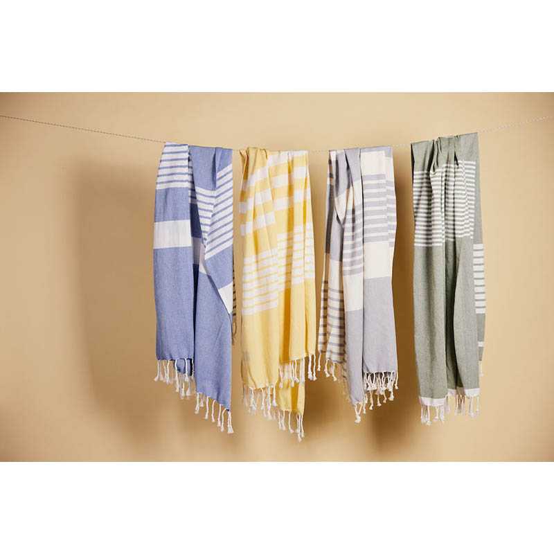 Ella hamam is a classically patterned towel with fringes made of thin, woven recycled cotton (70%) and polyester (30%). The striped patterns are characteristic for Sagaform and vary with the colours. Available in soft tones of blue, green, yellow and grey. The towel dries quickly and is simple to hang. Easy to roll up and bring to the beach, the pool or the training. Looks lovely together with Eden hamam. Available in sizes 50x70 cm, 90x170 cm and 145x250 cm. Packaged in nice paper girdle. Material: 70% recycled cotton, 30% polyester Weight: 265 g Width: 170 cm Color: Blue