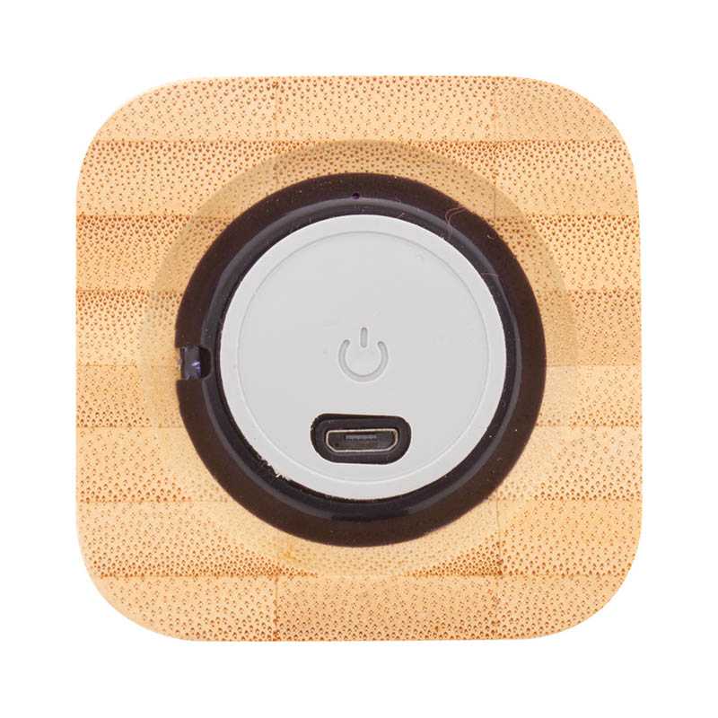 NOVINKA 2025. Nature line speaker, with Intelligent LED Technology and Bluetooth® 5.0 connectivity. Made of bamboo, from natural cut bamboo pieces. 3W power, 2 position multicolor light and rechargeable via USB cable -included-. Presented in an attractive, individual, eco-design box.