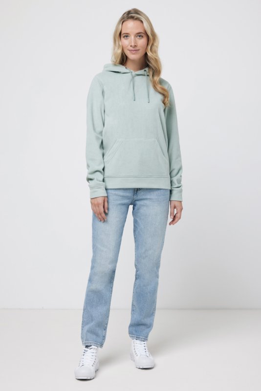Unisexová medium fit mikrofleecová mikina vyrobená zo 100% post-consumer recyklovaného polyesteru s gramážou 240 g/m2. Praktické klokanie vrecko, dvojvrstvová kapucňa s tónovanou šnúrkou a kovovými očkami. Spodný lem a manžety rukávov sú vyrobené z vlastnej tkaniny pre extra mäkkosť. Tkaný polmesiac na vnútornej časti za krkom ponúka ideálny priestor na značenie logom. Obsah recyklovaných materiálov je garantovaný vďaka využitiu technológie AWARE™, ktorá kombinuje možnosť skenovania materiálu a technológiu blockchain. Každý produkt Iqoniq vlastní unikátny štítok s QR kódom, ktorý odkazuje na príslušný digitálny pas produktu. 2% z výťažku každého predaného kusu je darovaných na Water.org. Certifikované OEKO-TEX® STANDARD 100 2303045 Centexbel.