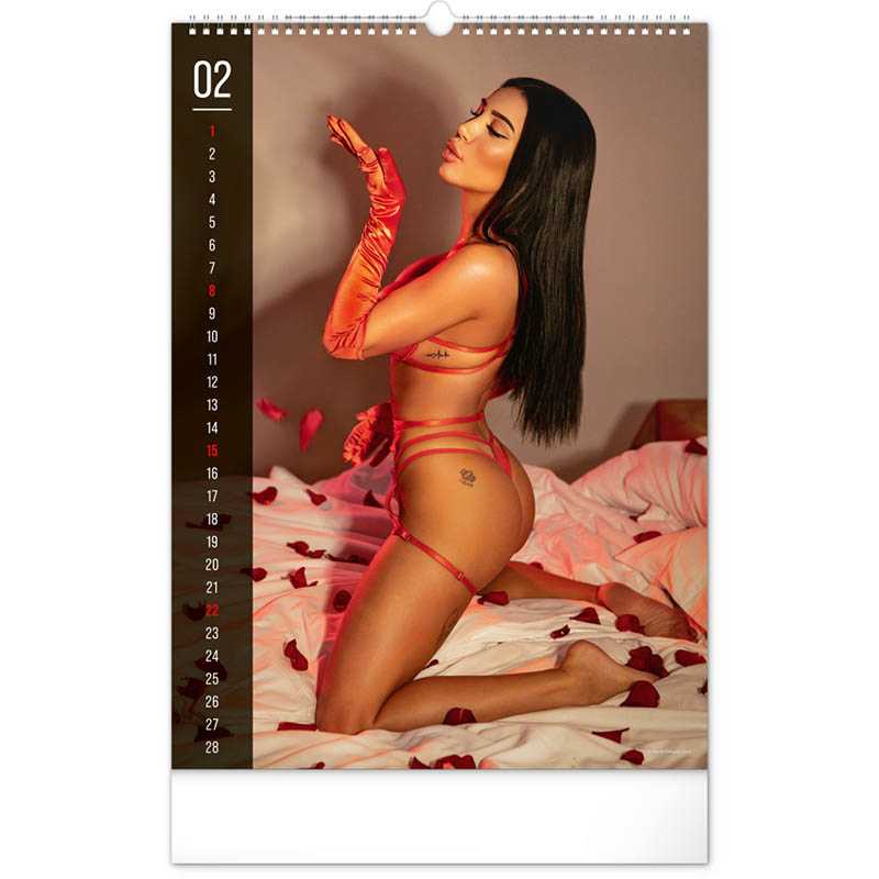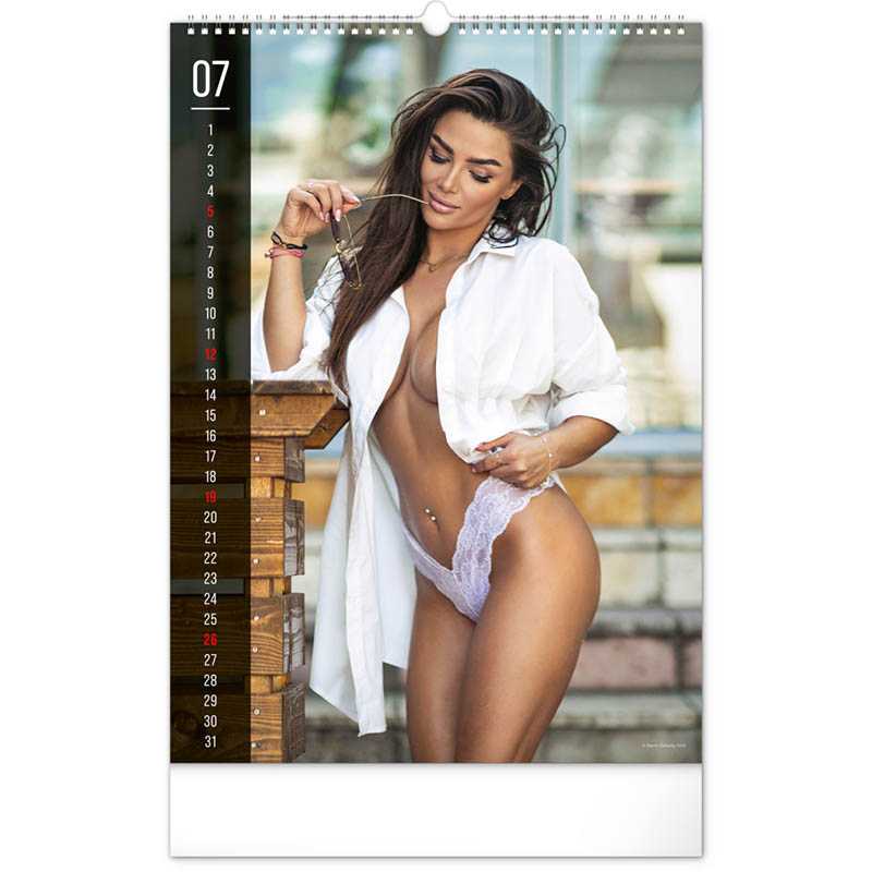 Exkluzívne akty krásnych dievčat. Kalendár obsahuje jednoduché kalendárium so zvýraznenými nedeľami na čiernom pozadí.Priestor na potlač: 33 x 6 cm. Rozsah: 14 listov. Rozmer: 33 x 46 x 1 cm. Hmotnosť: 0,6. Papier: 150 g/m2. Väzba: dvojitá špirála. Kalendárium: neutrálne.