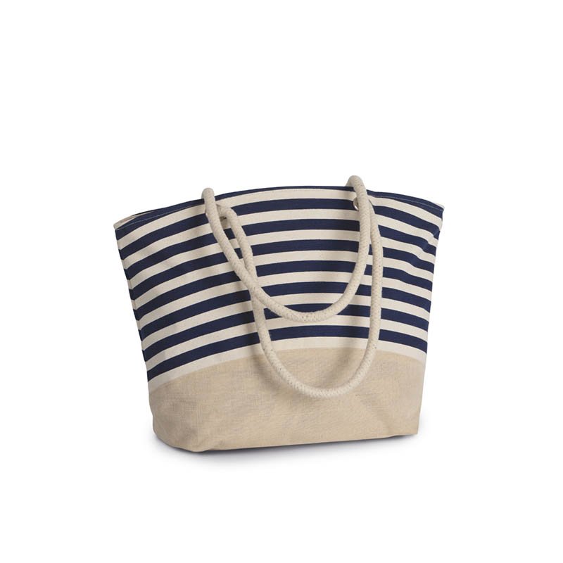 70 % juta/30 % bavlna.Nákupná taška/kabelka s námorníckou potlačou z bavlneného plátna a juty.Bavlnené uši s vnútornou šnúrkou v prírodnej farbe.Vnútorné vrecko.Zapínanie na zips.Dokonale sa hodí k vrecku KI0752 z rovnakej kolekcie.