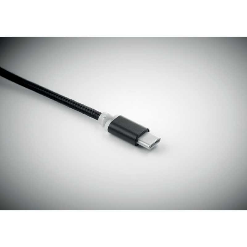 USB kábel 3 v 1 vyrobený z ABS a PVC. Jeden koniec je USB-A, zatiaľ čo druhý koniec má USB-C koncovku a špeciálny microUSB a Lightning koncovku 2 v 1. Dodávané v PP krabici. Krabička: o53 x 20 mm