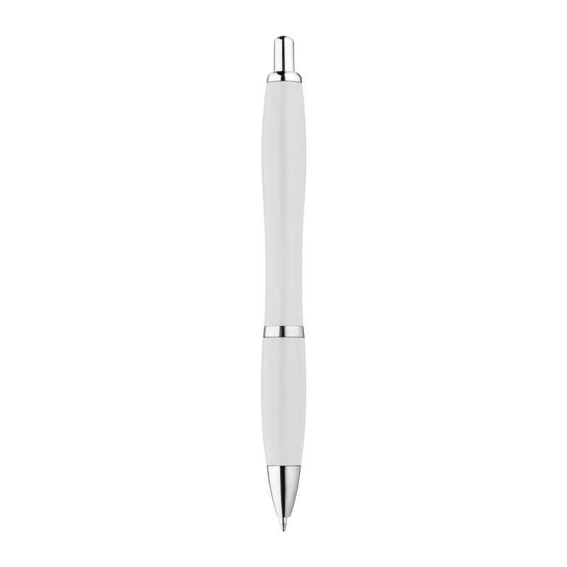 Plastové guľôčkové pero s modrou náplňou a mäkkou vrúbkovanou gumenou úchytkou.