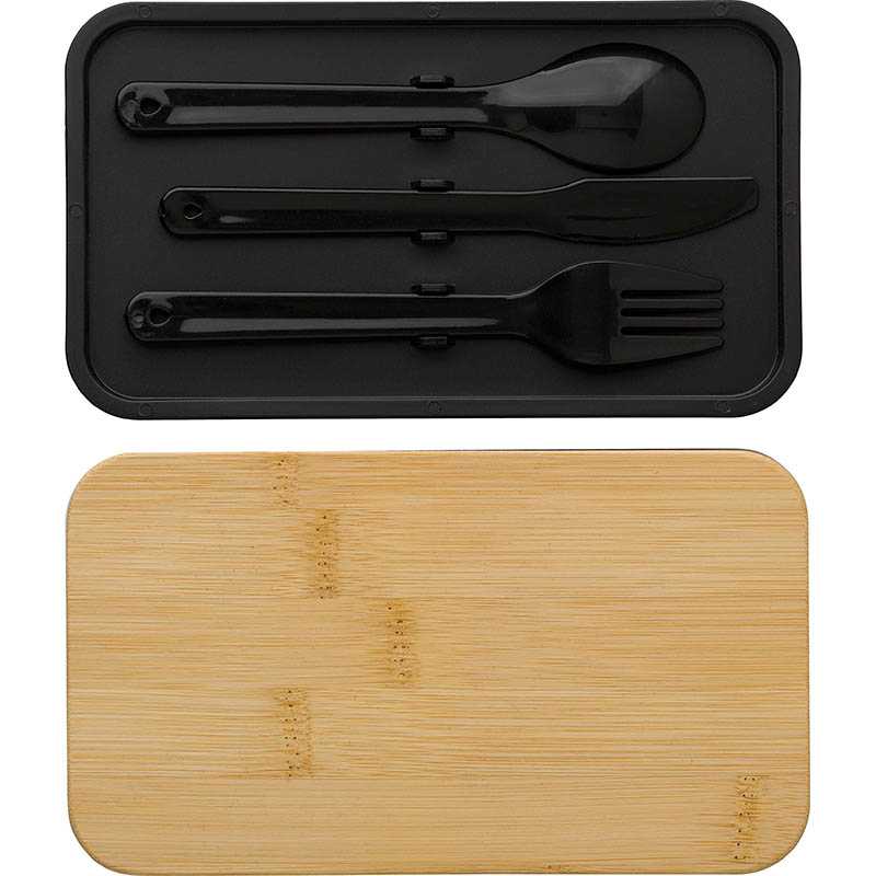 Obedový box z PP plastu so súpravou príborov (vidlička, lyžica a nôž), bambusovým vekom a elastickým popruhom. S 2 priehradkami, každá s objemom 700 ml.