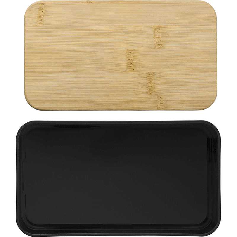 Dvoupatrový box na svačinu z PP s odnímatelnou přepážkou a 3 příbory. Zavírání pomocí pásky. Bambusové víko slouží i jako stojánek na telefon. Objem: 400 ml (2x). Bambus je přírodní materiál, může dojít k mírným změnám barvy, dekorace a velikosti. Neteče