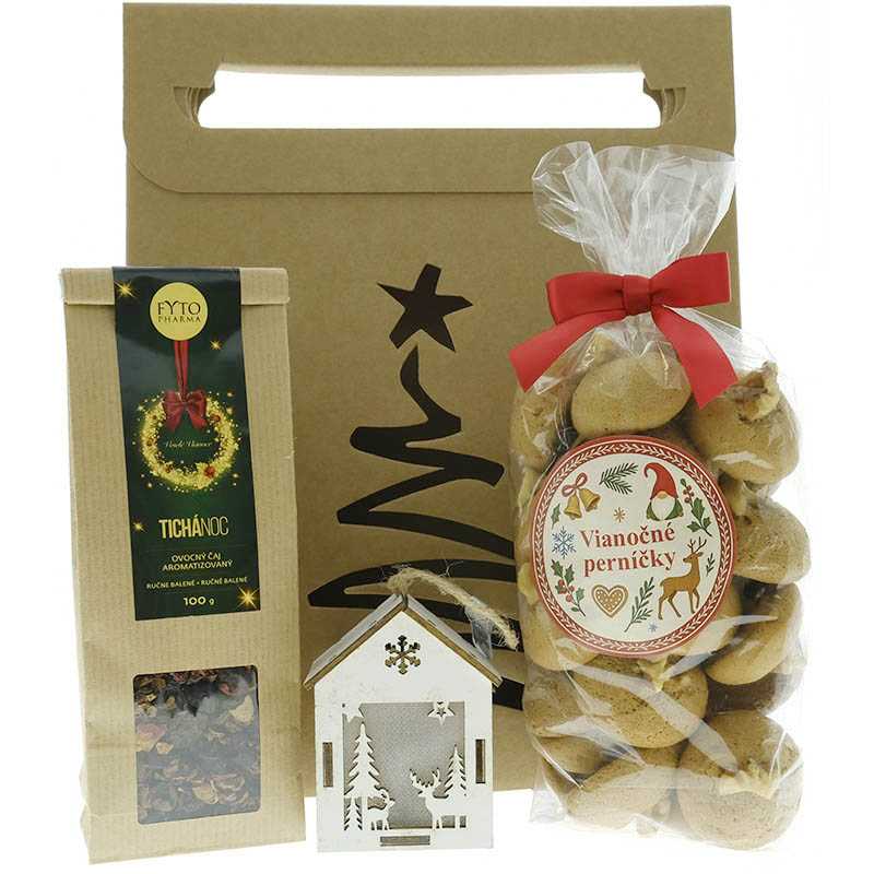 Vianočná dekorácia, Vianočné perníky 250g, Tichá noc 100 g sypaná ovocná zmes. Darčeková taška 30x23x10 cm