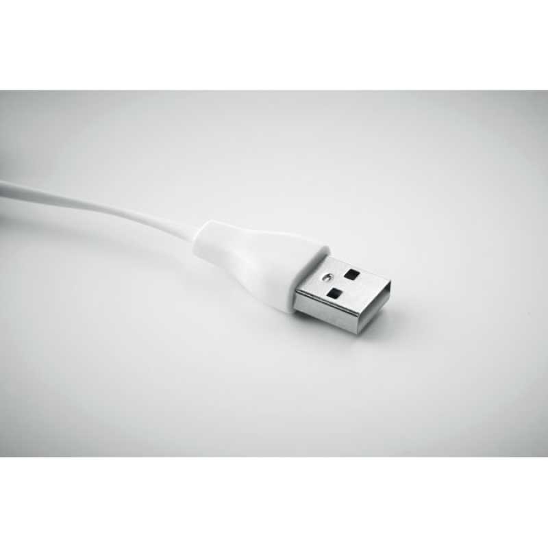 USB charger key holder with paper details. With USB-C, micro-USB, and lightning. Individually packaged in a brown cardboard box.