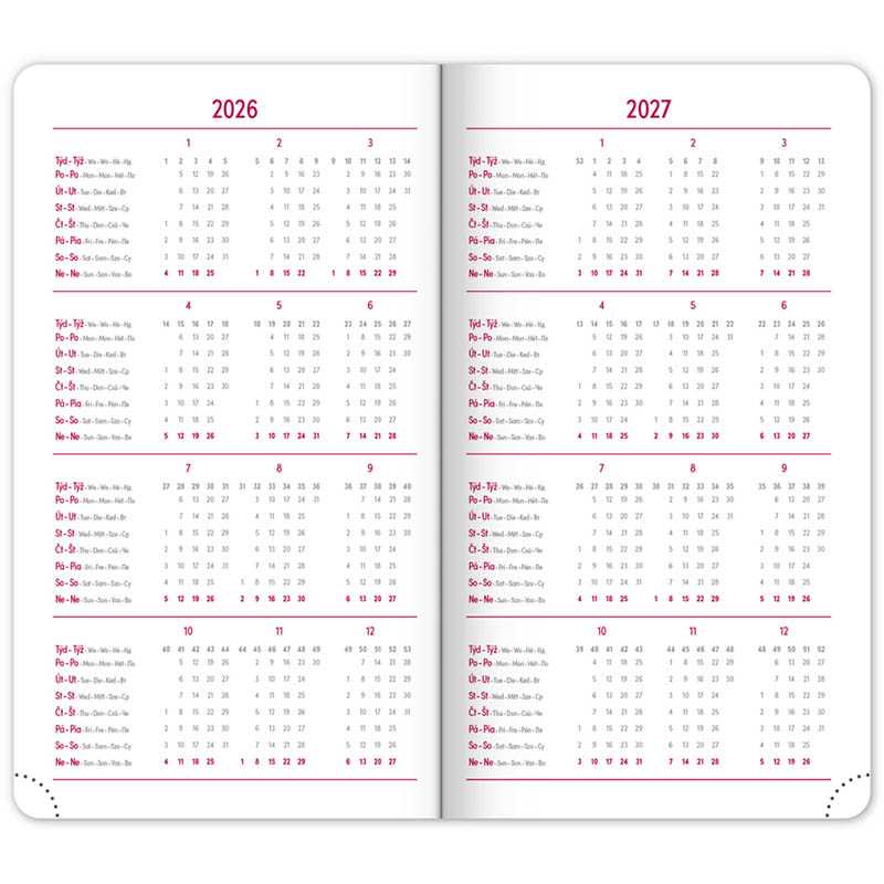 Nová, cenovo dostupná rada diárov s obálkou z ekologického papiera spája štýl a udržateľnosť. Týždenné rozloženie s česko-slovenským kalendáriom a doplnkovou angličtinou, nemčinou, maďarčinou a ruštinou.• kalendárium od decembra 2025• ročný plánovací kalendár 2026–2027 • pracovný plánovací kalendár • sviatky Českej a Slovenskej republiky a medzinárodné sviatky • rozšírený zoznam českých mien • miesto pre osobné údaje • perforované rožky• priestor pre poznámkyRozsah: 128 strán. Rozmer: 9 x 15,5 x 1 cm. Hmotnosť: 0,08. Papier: 70 g/m2 krémový papier. Väzba: tuhá knižná. Kalendárium: 6 jazyčné (CZ, SK, GB, DE, HU, RU) .