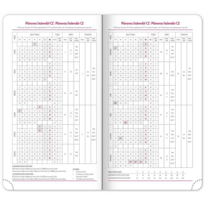 Osemnásťmesačný diár obsahuje prehľad na rok 2025 a 2026, zoznam českých a slovenských mien, česko-slovenské týždenné riadkové kalendárium s menami a sviatkami a priestor na poznámky. Kalendárium začína v júli 2025 a končí v decembri 2026.Rozsah: 192 strán. Rozmer: 11 x 17 x 2 cm. Hmotnosť: 0,2. Papier: 80 g/m2. Väzba: tuhá knižná. Kalendárium: týždenné 18 mesačné 2 jazyčné (CZ, SK).