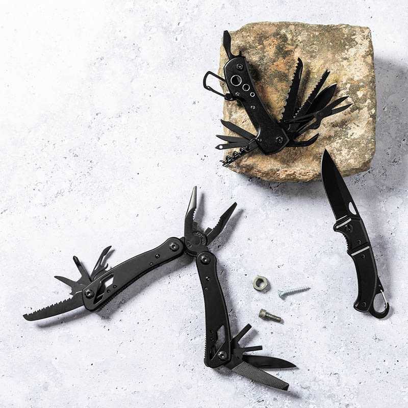 Čistý čierny design v kombinácii s vysokou kvalitou a funkčnosťou. Telo vyrobené z luxusného hliníka, nástroje a čepeľ z prémiovej 420 nehrdzavejúcej ocele. Všetko v čiernom odtieni. Disponuje celkom 13 funkciami: nôž, malý nôž, pílka, pilník, plochý skrutkovač, štandardný a malý krížový skrutkovač, otvárač fliaš a plechoviek, vývrtka, nástroj na šitie, dierovač kože, nôž na balíky. Balené v luxusnej darčekovej krabičke.