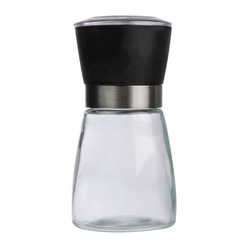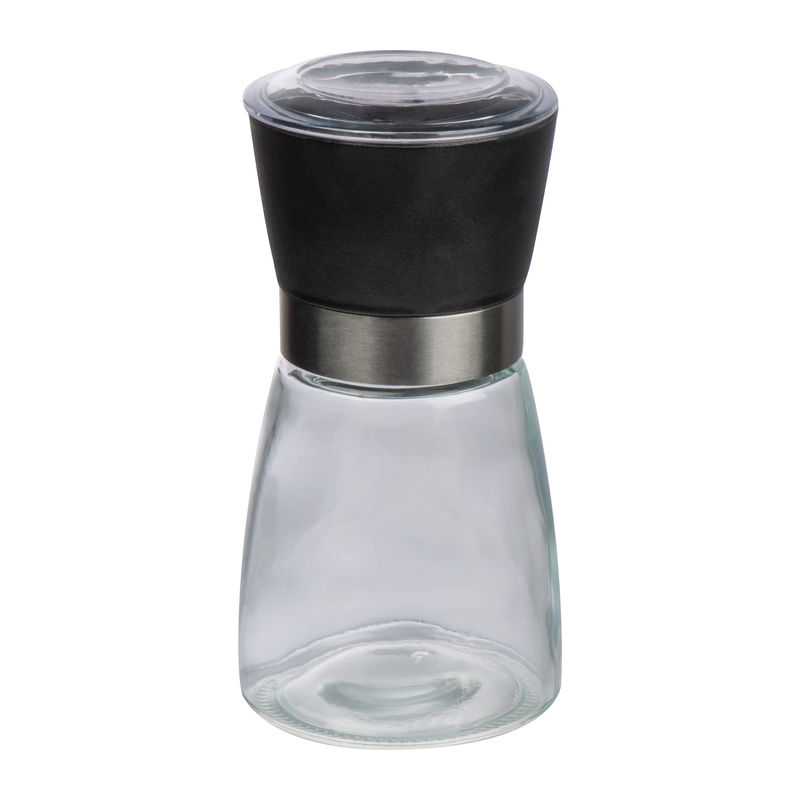 Sklenený mlynček na korenie s objemom 150ml a keramickou čepeľou. Veľkosť pomletia je možné nastaviť otočením čiernej časti.