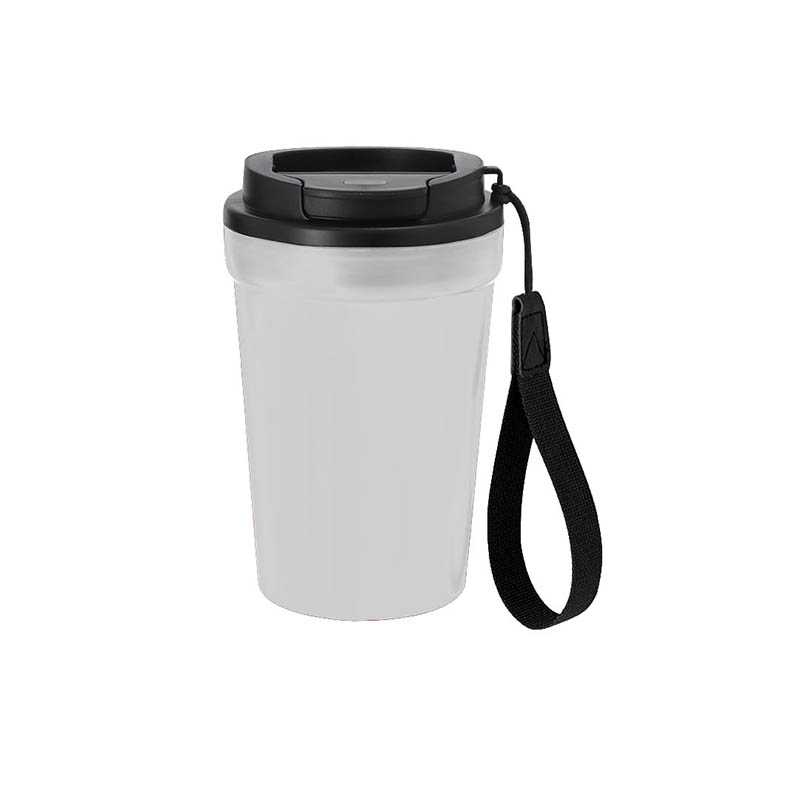NOVINKA 2025. 360 ml capacity cup made from durable recycled PP. Body with frosted translucent finish. Hermetic lid in black with easy-to-open dispenser, free of BPA, with screw closure and includes a handy polyester carrying handle. With Food Grade certification, ensuring safety when food contacts with the material used to manufacture the product.Recycled PP is a recycled and highly recyclable plastic, featuring great resistance and suitable for a multitude of applications.