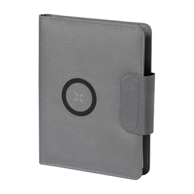 Polyesterová zložka na dokumenty A4 z 300D RPET so vstavanou magnetickou bezdrôtovou rýchlonabíjačkou (10W), powerbankou 5000 mAh s USB portom na nabíjanie, skladacím držiakom na mobil a 20 linkovaným poznámkovým blokom. Vrátane samolepiaceho kovového krú