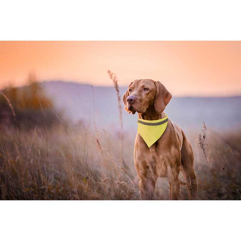 NOVINKA 2025. Reflective necklace bandana for pet in resistant and soft polyester of high visibility. With reflective band, adjustable buckle closure strap and metal accessory for belt.