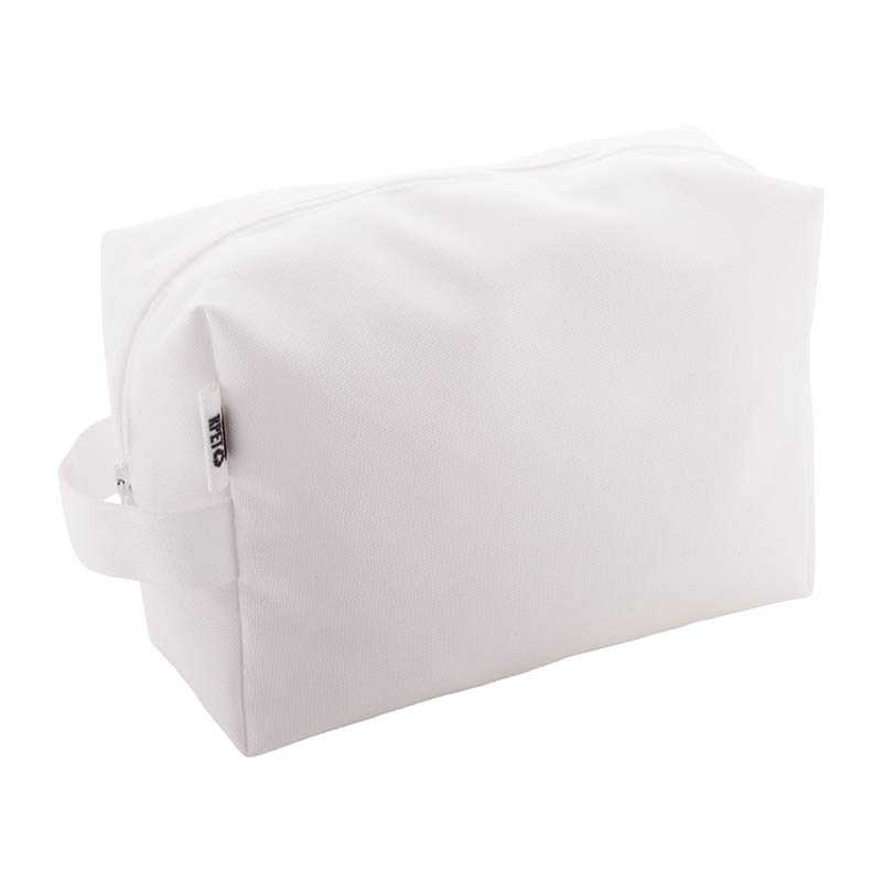Na zakázku vyrobená kosmetická taštička na zip z 600D RPET polyesteru s uchem. S celoplošně tištěnou sublimační grafikou, nezahrnuje tiskovou přípravu. Min. mn.: 50 ks.