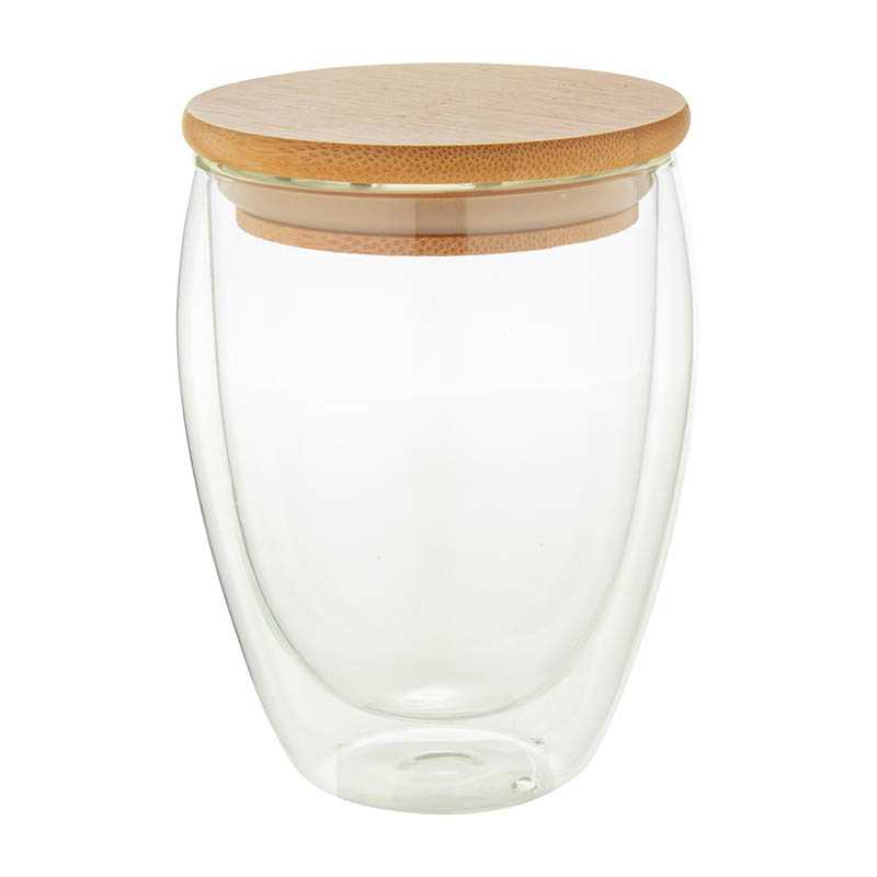 Dvojstenný termohrnček z borosilikátového skla s uškom a bambusovým viečkom, 350 ml. V kraft papierovej krabici.
