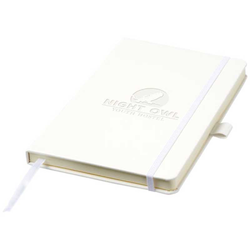 Poznámkový blok s imitací kůže A5 (14,2 cm x 21,4 cm) (koženka) s elastickým páskem, záložkou, smyčkou na pero a skládací zadní kapsou. Obsahuje 96 listů řádkovaných krémových papírů o hmotnosti 70 g/m2 a je nabízen v bílém pouzdru Journalbook.