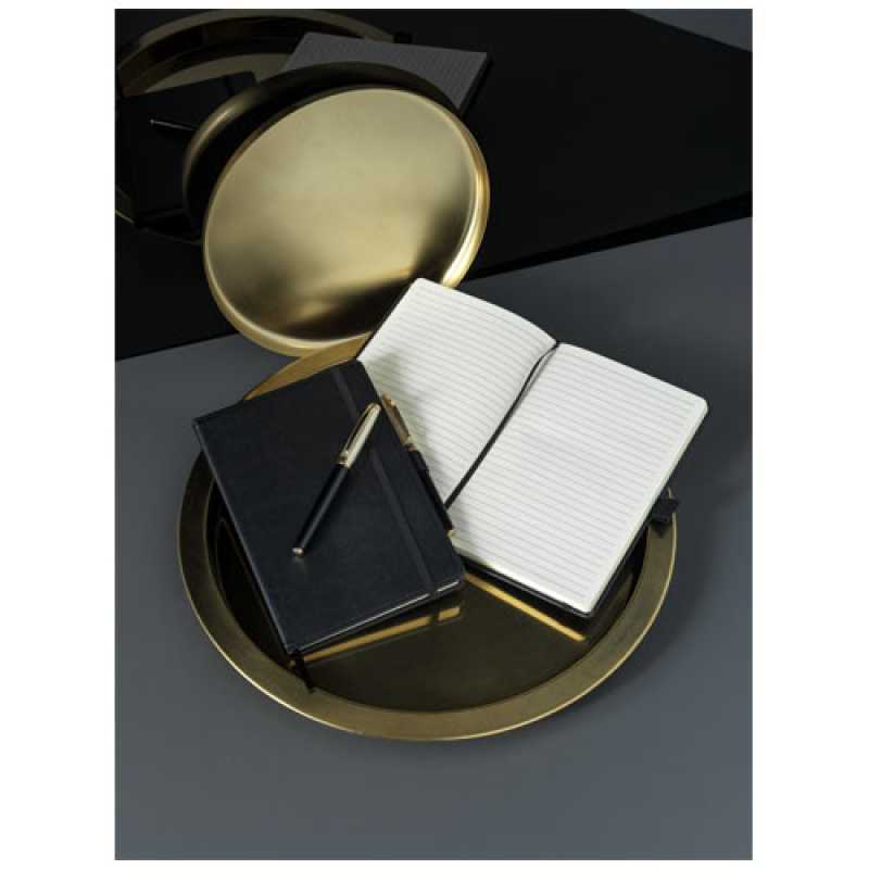 Zápisník s měkkou flexibilní obálkou (velikost A5) s integrovaným elastickým uzávěrem, stužkou na založení stránky, smyčkou na pero, kapsou na dokumenty na vnitřní zadní obálky a 80 listy (80g papíru) krémového papíru. Baleno v černém pouzdru.