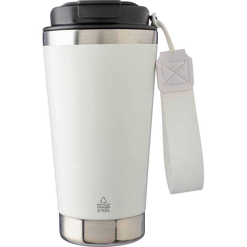 Recycled stainless steel double-walled drinking mug (500 ml) with a PP lid and matching carrying strap. The interior is made of stainless steel 304, and the exterior is stainless steel 201. Keeps contents hot for 5 hours and cold for 8 hours