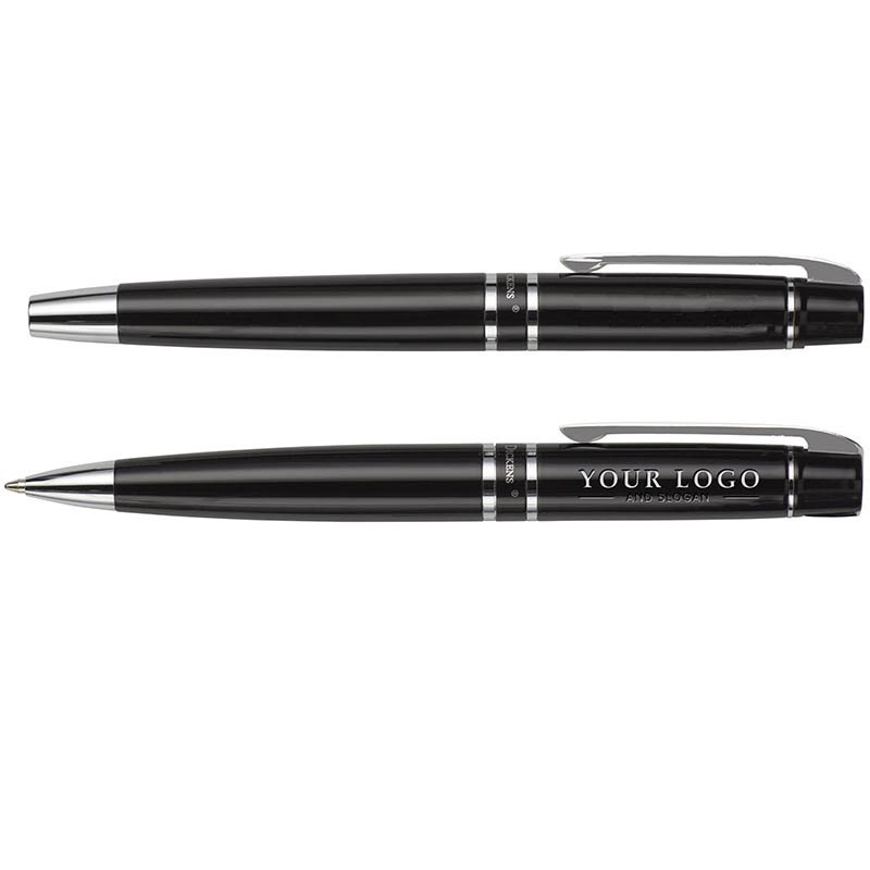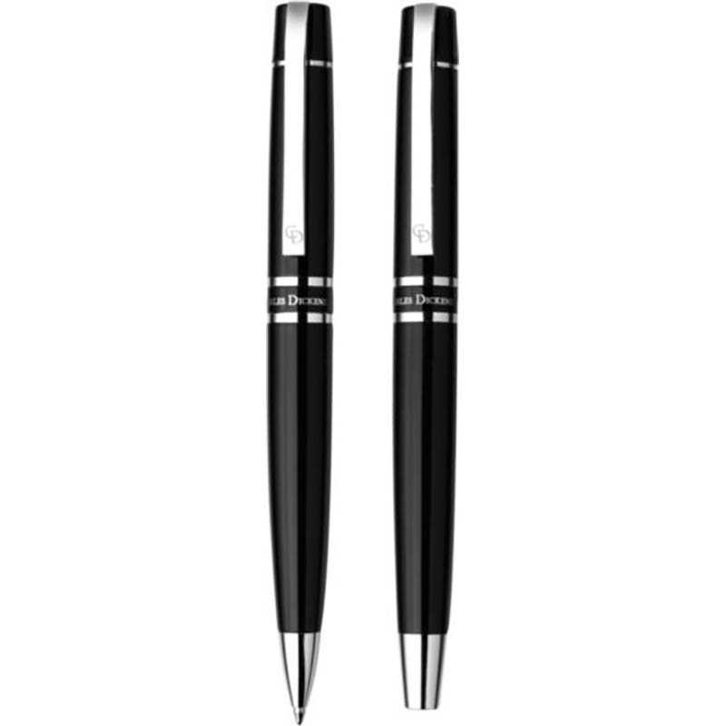 Charles Dickens® metal ballpen and rollerball pen with Charles Dickens® engraved clip. Packaged in a deluxe pen case. Black ink.