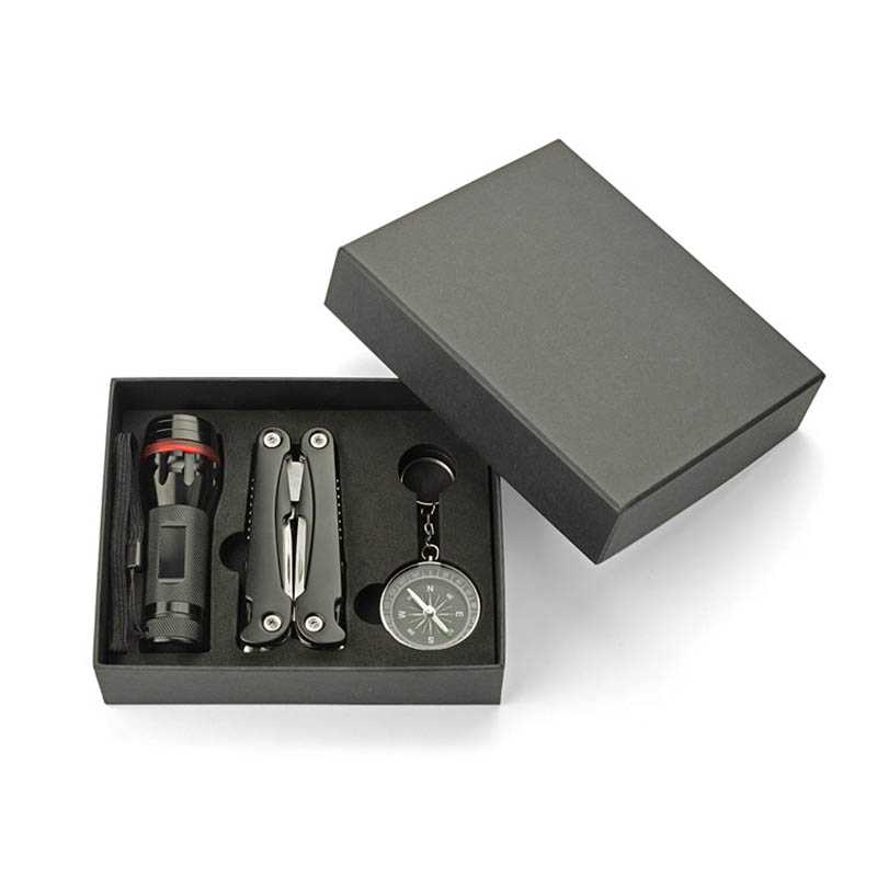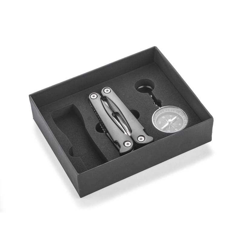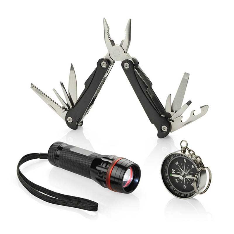 Sada darů zahrnující baterku, multifunkční nástroj a kompas. Baterka má velmi silnou diodu, nastavitelný světelný paprsek (funkce zoomu) a 3 režimy světla: silný, slabý a blikající. Každý prvek je vyroben z kovu a sada je balena v elegantní černé krabičce.