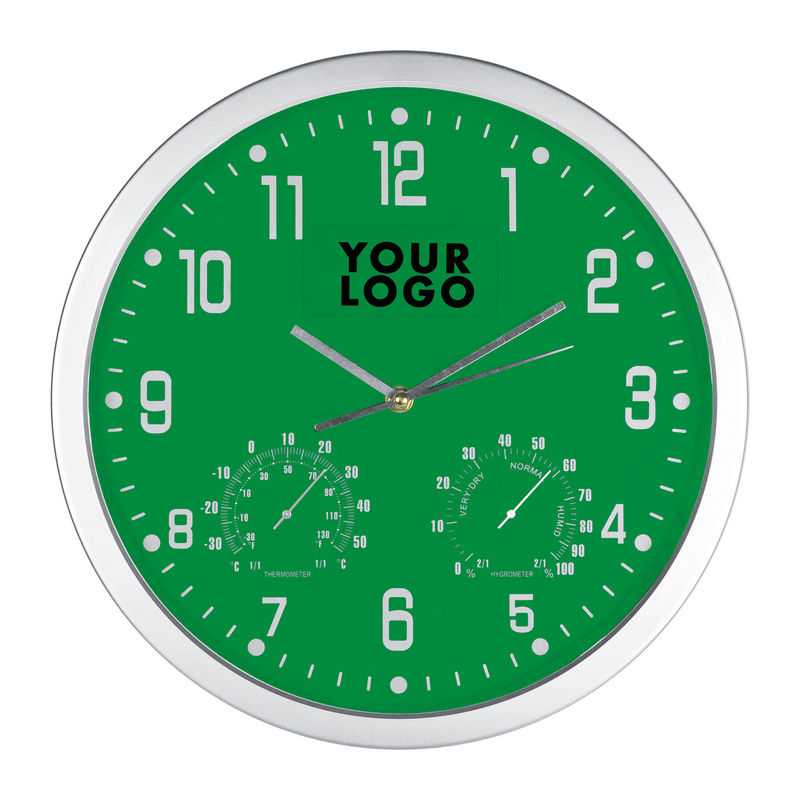 Štýlové nástenné hodiny s Hygro a teplomerom - polovica ciferníka sa dá ľahko vybrať z rámu a potlačiť celoplošne. Nekonečné možnosti pre tlač Vašej reklamy!