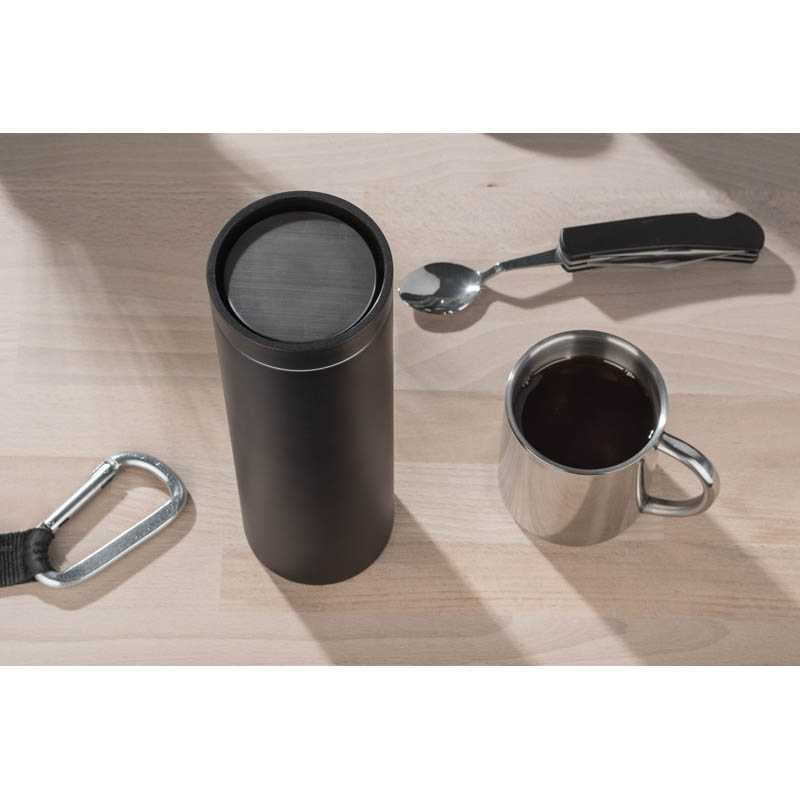 Komfortní hrnek je výroben z oceli. Vnitřek je výroben z nerez oceli zvýšených standardů. Objem 440 ml. Zajímavá konstrukce stiskacího uzávěru umožňuje pití ze všech stran a zajišťuje velmi vysokou úroveň těsnosti. Udržuje teplotu až 13 hod. Hrnek má protiskluzové dno.