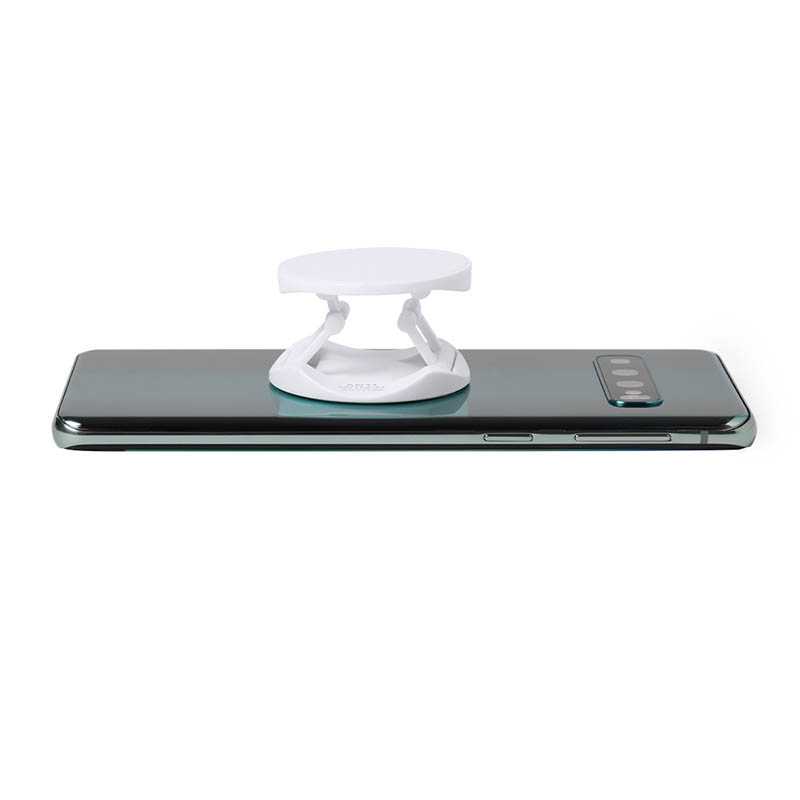 NOVINKA 2025. Antibacterial, folding holder for smartphone in an elegant, white color design. Especially designed for pad printing, with 3M adhesive tape, extra strong fixation and residue free when detached from the device.Products with antibacterial treatments are able to drastically reduce the bacterial levels present on the surfaces of the materials, thanks to the addition of permanent static microbial agents, with high effectiveness in inhibiting and preventing bacterial contamination.Item according to the ISO 22196 standard, which determines the antibacterial activity in plastic materials and non-porous surfaces. This allows us to know the effectiveness of microbial inhibition that additives have on treated objects by means of a quantitave evaluation.