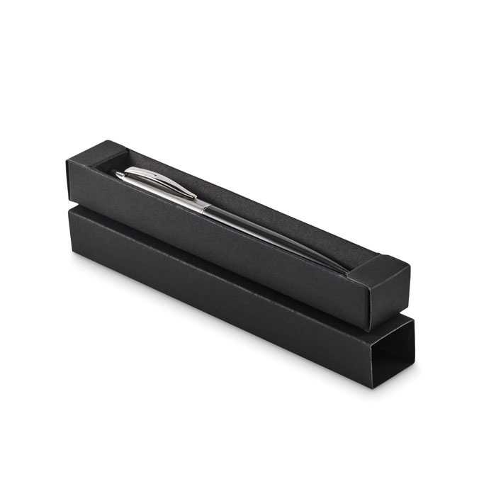Aluminium and brass ballpen. With shiny details on the clip, ring, and push button. Blue ink. Individually packaged in magnetic giftbox with paper sleeve.