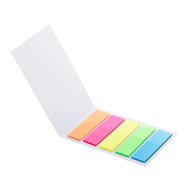 Papierom potiahnuté značkovače stránok. Obsahuje 100 plastových fóliových značkovačov stránok v 5 rôznych farbách (44x12 mm). Cena zahŕňa celofarebne potlačený vonkajší obal, nezahŕňa tlačovú prípravu. Min. mn.: 100 ks.