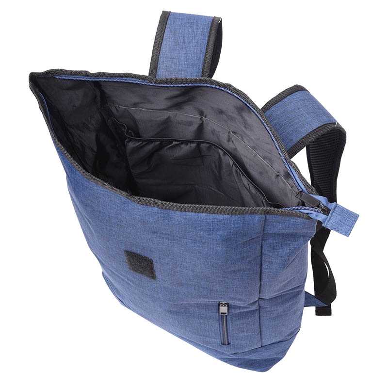 Backpack MESSENGER: front pocket with vertical zip, main compartment with zip and padded inner pocket for laptop or tablet, can be rolled up and closed with touch fastener, padded shoulder straps and back panel, grab handle