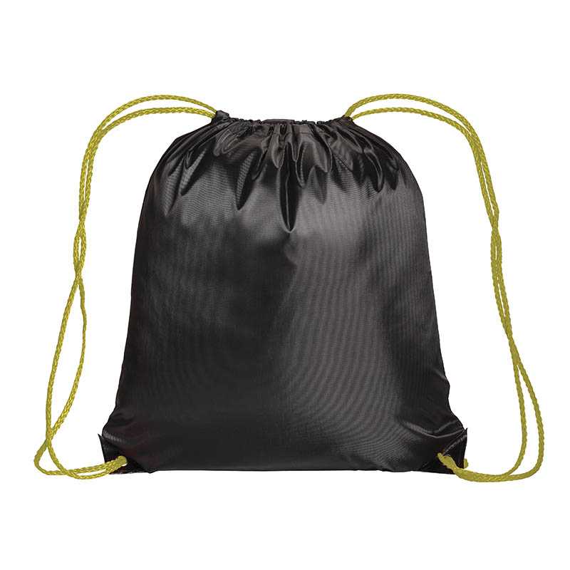 Black 210T polyester backpack with drawstring closure, reinforced black corners and coloured strings