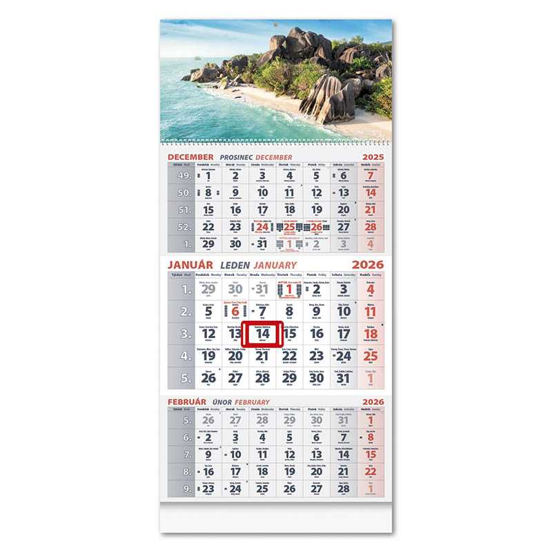 Prehľadný dvanásťlistový trojmesačný nástenný kalendár s jednou špirálou je veľmi populárny a žiadaný. Má posuvné okienko pre lepšiu orientáciu v mesiaci, kalendárium so slovenskými a českými menami a sviatkami, a tiež sviatkami krajín EÚ. Vhodný aj pre organizácie a spoločnosti. Ponúka možnosť umiestnenia vlastnej grafiky namiesto obrázku na vrchný lash, či potlač podložky. Na druhej strane vrchného lashu nájdete kompletný prehľad sviatkov vo všetkých krajinách EÚ.