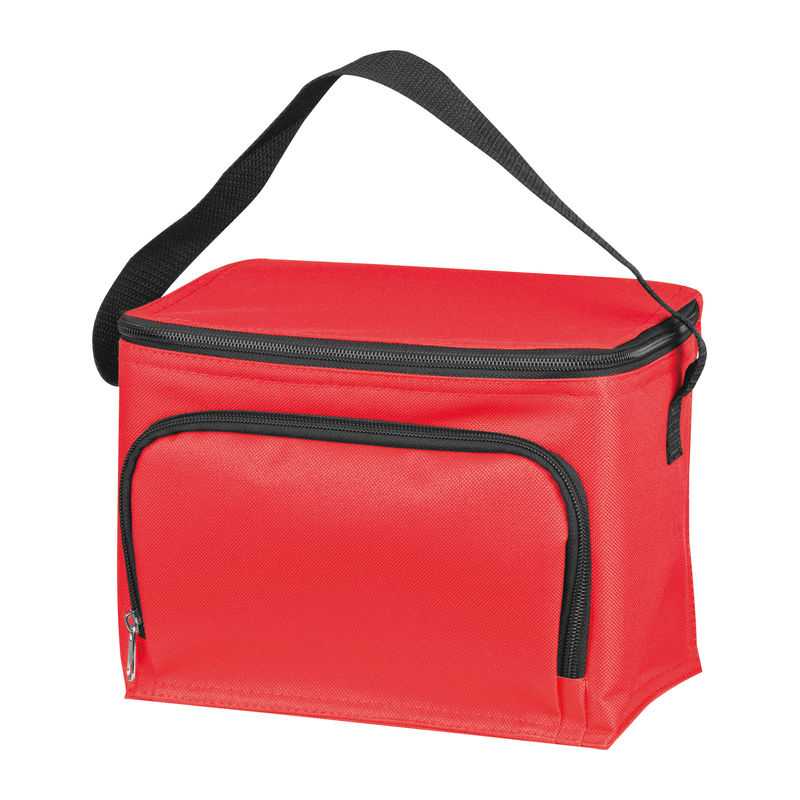 600D polyester cooler bag, ideal for a 6-pack of drinks cans. With a carry-strap.