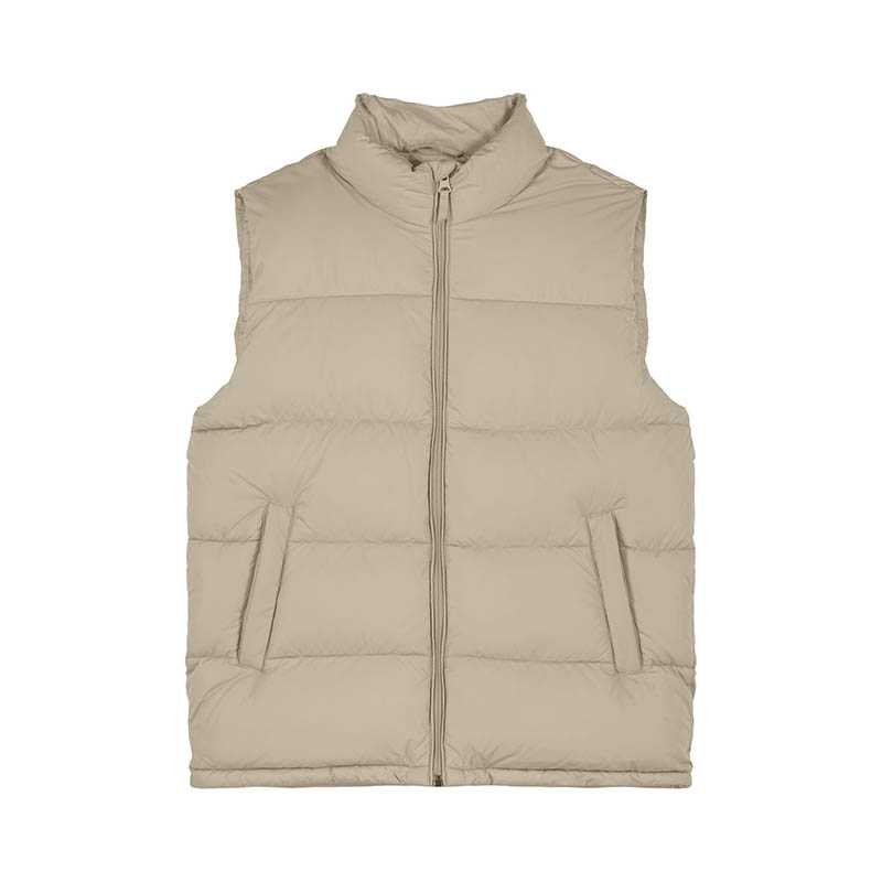 Sleeveless High collar Reverse nylon zip at center front Zipped welt pockets with extra grosgrain puller Elastic tape binding at armhole Fully quilted Side panels for better shape Inside seams with binding finish Bottom h