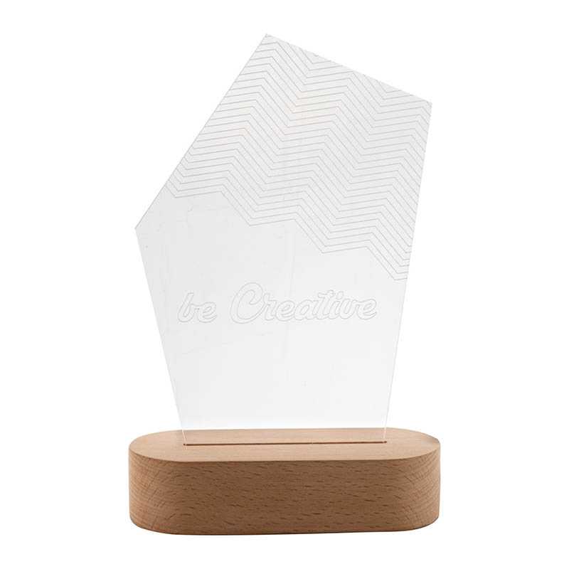NOVINKA 2025. Akrylová trofej na zákazku na drevenom podstavci s viacfarebným LED svetlom napájaným cez USB. V unikátnom tvare s gravírovanou grafikou. S USB nabíjacím káblom. Cena vrátane gravírovania, cena nezahŕňa tlačovú prípravu. Min. mn.: 25 ks.