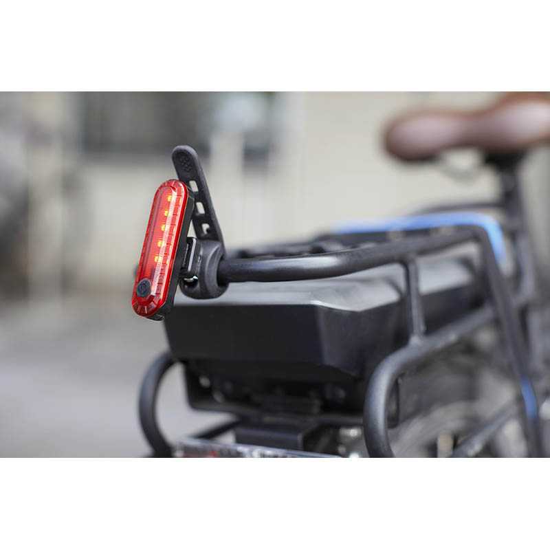 ABS and PC rechargeable bicycle light, detachable from the holder. The COB LED lights have four different settings. The light has a silicone strap and is chargeable via micro USB port. Cable included.
