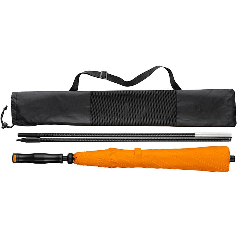 Easy to handle thanks to hand friendly runner, high-quality Windproof PLUS system for maximum frame flexibility in stormy conditions, ribs and 2-section foldable lower shaft made of sturdy fibreglass, lower shaft with tip for fixing in the ground, cover with sun protection factor UPF 50+, convenient carry case with shoulder strap and mesh, suitable for trolley suitcases, hospitable diameter, parasol also useable as umbrella, excluding ground spike (art. 8939)